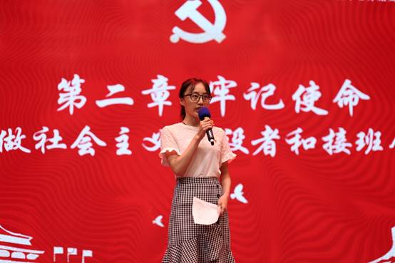 在第二篇章“牢记使命”中,党员们重温了习近平总书记在纪念五四运动100周年大会上的讲话,深刻领会当代青年的责任担当。毕业生党员代表刘倩倩在谈学习体会时说:“即将毕业离校了,走向新的人生起点,作为新时代青年,要保持理想信念和奋斗精神,让奋斗成为青春最亮丽的底色。”