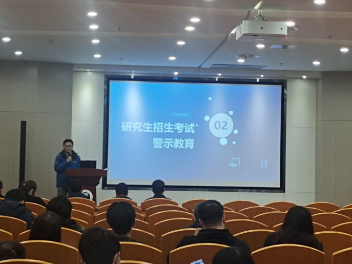 随后,学部党委副书记邓飞做了研究生招生考试工作警示教育。他介绍了当前研究生考试报名情况,阐释了高校做好研究生招生考试工作的重要意义,并通过通报校内外影响重大的负面典型案例,对全体教职工特别是研究生招生考试工作人员敲响了警钟。为了高质量完成2024年研究生招生考试工作任务,他向大家提出了四点要求:一是要提高政治站位,二是要落实主体责任,三是要严明纪律规矩,四是要从严监督执纪。