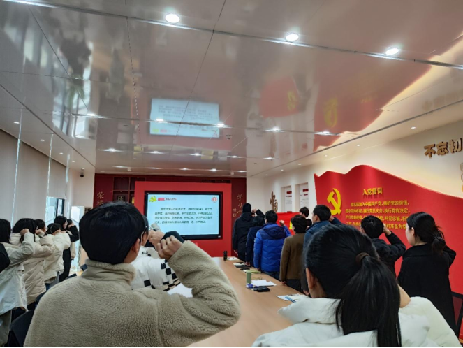 会议伊始,支部副书记张行带领全体与会党员重温入党誓词,大家高举右手,面对鲜红的党旗庄严宣誓。