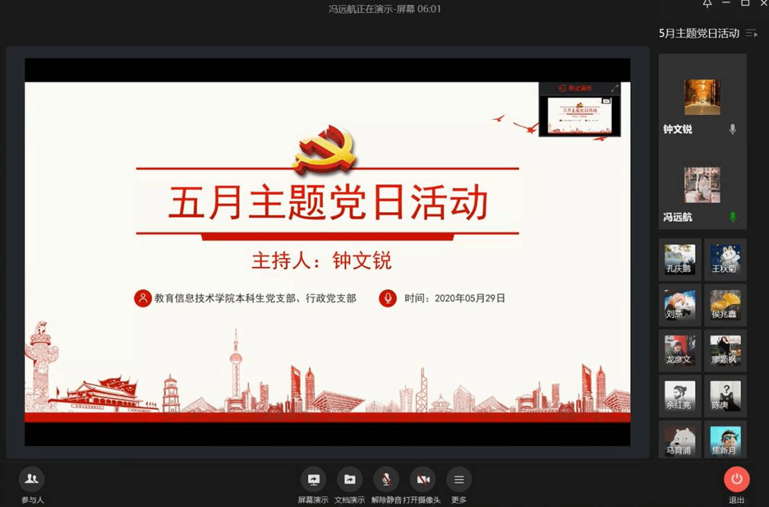 2020年5月29日下午3点,我院本科生党支部和行政党支部通过企业微信联合开展5月线上主题党日活动,本次主题党日活动共有2个环节:学习讨论2020年“两会”精神和我为人工智能教育学部建设献一策。活动由院党委副书记、行政党支部书记钟文锐主持,院党委书记游丽以普通党员身份参加学习,行政党支部、本科生党支部全体党员参加。
