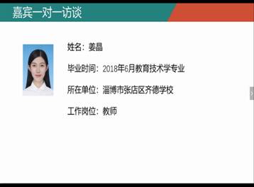 第一位分享人是姜晶学姐,她在淄博市张店区齐德学校担任信息技术教师。学姐首先分享了自己选择教师岗位的原因,强调喜欢学生热爱教师岗位很重要。其次,她具体讲解了求职前的准备以及考试科目,如何化解求职中的焦虑情绪等。在访谈中她提到,要先确定目标和方向,不要受到周围同学的影响以及看到哪里招老师就去哪里,结果疲惫的同时也可能打乱自己的步伐。在面试中要做好准备充满自信,自信是建立在有准备的基础之上。