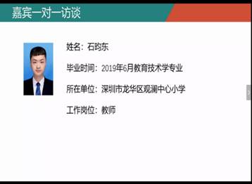 第二位分享人是石昀东学长,他在深圳市龙华区观澜中心小学担任信息技术教师。学长用亲身经历告诉大家要尽早想清楚自己的职业发展方向,制定好明晰的职业规划,弄清楚工作待遇及工作内容是否适合自己。其次,他提到制作简历时要了解招聘方的意图,尽量把自己的技能及学习成果多写一些。最后,学长结合自己面试中的遇到的问题给同学们具体讲解了如何抓住面试官的需求,更好的展示自我优势吸引对方的注意,同时面试试讲时还要保证教学过程的完整性和考官适当的进行互动教学,恰当反馈。