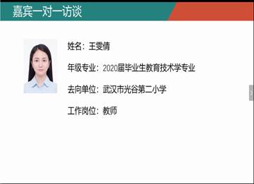 第四位分享人王雯倩学姐,她毕业后将去武汉市某小学担任信息技术教师。首先,学姐给大家讲解了湖北地区的各种招聘的信息,同时她建议综合考虑工作待遇、稳定性和地理位置等多种因素来选择适合自己的工作。其次,学姐分享了一些自己的面试技巧,面试要注意自己仪容仪表要符合岗位要求,试讲大方且要注意时间的把握,注意课堂的导入、互动、总结等,评价方式的多元化。最后建议大家一定不要给自己太大的压力,学会适当放松自己,多试讲,让同学们帮忙提提建议。