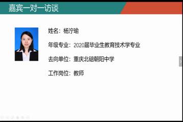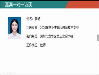 最后一位分享嘉宾是李杨学姐,她将要去往深圳市龙华区第三实验学校担任信息技术教师。首先,学姐表示,在准备简历时,可以凸显自己在校期间相关荣誉的获得情况。同时,她在访谈中提醒大家在求职的时候要提前准备好相关支撑材料纸质版和电子版。在面试中要时刻保持谦卑的态度,不论面对怎么样的面试与提问,都要保持微笑与平和的谈吐。未来两年深圳还会继续壮大教师队伍,希望大家提前做好充分准备,及时抓住机遇。最后,她建议学弟学妹们要端正态度、调整心态。