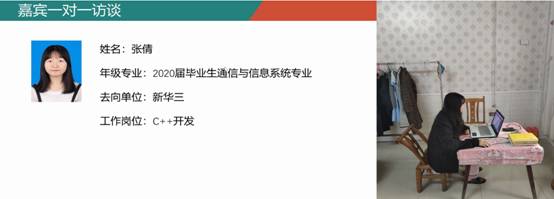 第四位分享人张倩学姐,她将在新华三从事C++开发工作。首先,学姐给大家分享到在求职前一定要为自己做好找工作的规划,比如自己理想的公司、工作岗位、工作地点等,并建议抓住内推机会。其次学姐讲解到职位有很多,需求也多,然而竞争者也多,焦虑一定会有的,当我们发现自己心态出现问题时,一定要及时向导师、同学、朋友、家人寻求帮助,多进行沟通。求职的过程就是一个比拼心态的过程,坚持到底是找到工作的必备条件。最后,她分享了一些自己的面试技巧,在面试之前,可以在网上事先搜集整理该公司岗位在每次面试中着重考察的要点,针对性准备效率会更高,在面试中要注意自己仪容仪表要符合岗位要求,回答问题时,要逻辑清晰,这不仅是在考察专业知识也是在考察表达和交流的能力。