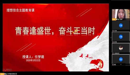 (通讯员 王乐璇)为增强社会主义道路自信、理论自信、制度自信和文化自信,树立爱国、爱党、爱社会主义的崇高信仰,教育大数据应用技术国家工程实验室2018级、2019级本科生于2020年3月22日通过腾讯会议APP开展了第二期线上主题教育课程——“青春逢盛世,奋斗正当时”。本次课程的授课人为辅导员任梦璐。