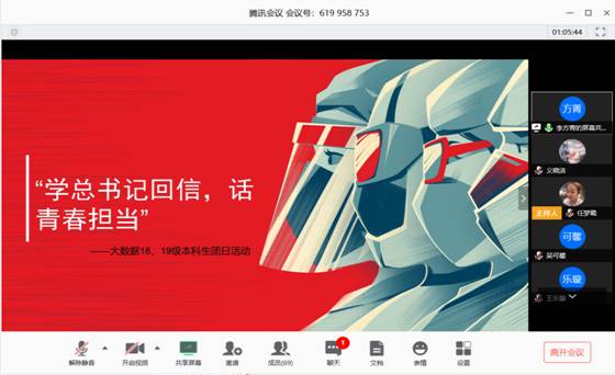(通讯员 义晓洁)为深入学习贯彻习近平总书记给北京大学援鄂医疗队全体“90后”党员回信精神,凝聚众志成城抗击疫情的强大青春力量,教育大数据应用技术国家工程实验室2018级、2019级本科生团支部积极响应号召,于3月22日下午通过腾讯会议开展“学总书记回信,话青春担当”主题团日活动。工程中心团委副书记、辅导员任梦璐,大数据实验室2018级、2019级全体本科生参加了本次活动。