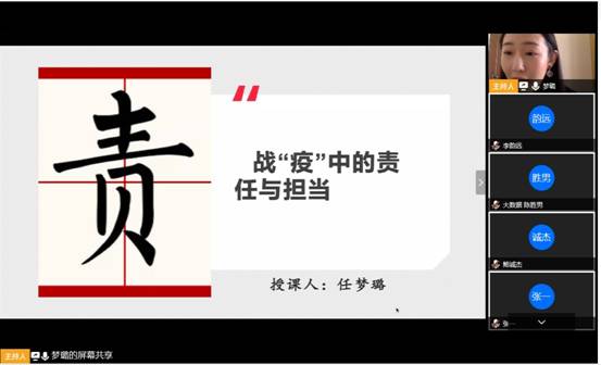 课程伊始,全体师生进行集体截屏“合影”留念。随后,任梦璐就“医者仁心,大爱有你;政者为民,以众心为心;兵者勇毅,护国担当”三个板块进行了第一部分“坚守之责——苟利社稷,生死以之”的讲解,讲述了疫情爆发以来政者、医者、兵者坚守一线、扛鼎而行的责任与担当。对于第二部分“互助之责——合众人之心,聚众人之力”,她重点介绍了社会各界自发挺身而出的志愿者们在抗疫期间的突出事迹,强调普通居民“不添乱”也是一种助力,并邀请了湖北籍同学交流疫情期间的居家感受。最后,任梦璐通过第三部分“成长之责——大学生应该怎么做”向大家提出了四点要求:要尽自律自爱之责;要尽自学提升之责;要尽理性思考之责;要尽担当奉献之责。