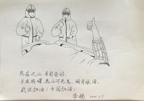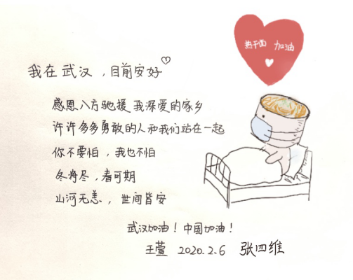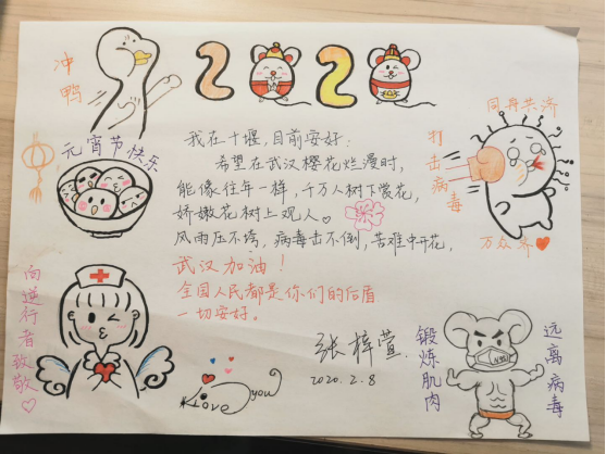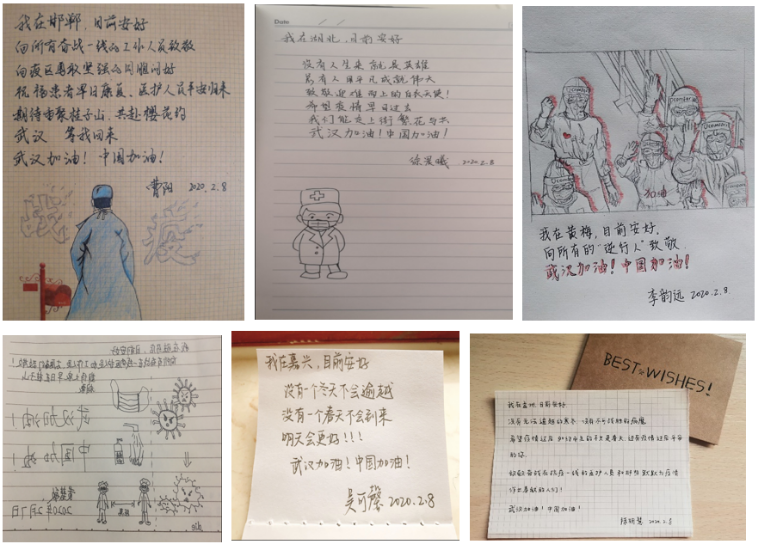手写加油接力活动内容分为:报平安、致敬与祝福、为国家加油鼓劲三个部分,同学们从个人平安出发上升到对前线抗疫工作人员的致敬和对国家的祝福,以文字传递温暖,用真心表达祝愿,在线上传递了浓浓的情谊。