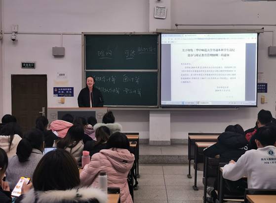 首先任梦璐组织同学们学习了《华中师范大学学生考试违规认定及处理办法》、《华中师范大学普通本科学生违纪处分与矫正教育管理细则》两则文件,引导同学们严格遵守考风考纪,坚持诚信考试。随后她组织学生们观看了《违规认定与处理方法》短视频,加强了考试违纪警示教育,进一步加强了学风建设。