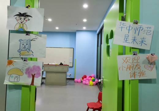 实践队员们于9点准时到达江岸区启慧特教中心。到达后,队员们为儿童布置了一间集“星科技”游戏区与“星陪伴”手工区、绘画区于一体的“星未来”教室,利用涂鸦绘画宣传我们的活动。本次不仅带来了星未来学习平台一体机还带来了平板电脑供更多的小孩体验。