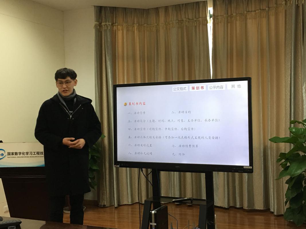 接下来高瑞阔分享了关于文案撰写的注意事项,主要从公文格式、策划书、公文内容三个部分讲解。他在讲解的过程中配合实例,使得培训内容生动形象。比如讲解落款时,以“工程中心”和“国家数字化学习工程技术研究中心”为例,提醒大家在写单位名称时要注意使用全称;讲解邀请函格式的时候,以教育学院迎新晚会邀请函为例,讲解邀请函制作的注意事项和制作经验。