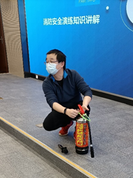 随后,叶立志老师通过播放新闻短片“造成死亡19人的火灾是如何发生的”,让学生们认识到快速反应并有效应火灾的重要性,因为对消防知识无知、错误操作很可能会使巴掌大的小火苗变为吞噬生命的火海。为此他带领学生们学习了如何科学灭火、使用灭火器:手提灭火器,在距火焰2-3米处,拔出保险销,半蹲,右手紧握喷嘴,对准火焰根部,左手按压把手。他特别提醒,不可在拔出保险销时因紧张而按压把手,否则难以拔出,浪费有效扑灭时间,家用灭火器有效时间为8-10秒,若之后仍无法将火扑灭,应立即撤离,寻求救援。在老师的悉心指导下,每位同学亲自体验使用灭火器灭火,错误动作都得到了老师的纠正指点。