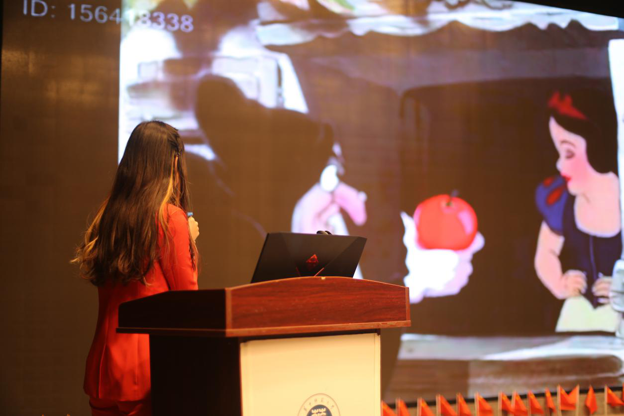 在主持人介绍赛制后,开始了“个人展示”环节,展示内容包括自我介绍和才艺展示。十位参赛选手采用PPT以及解说的方式介绍自己的优点与能力,并通过配音、歌曲、朗诵等多种方式向观众和评委嘉宾展示了自己的才艺,展现自己核心的竞争力。其中四号选手李佳阳在自我介绍后,结合自己的专业优势带来了配音秀《白雪公主和七个小矮人(片段)》,赢得了在场观众的一致赞誉。评委点评、提问完毕后,主持人根据现场得分统计宣布晋级第二轮比赛的名单,选手李佳阳、梁静、田万丘、石雅文、陈诺和彭艺璇进入第二轮比赛。