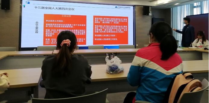 人工智能教育学部讯(记者郑雪织)2021年3月25日中午,人工智能教育学部团委学生会成员在南湖综合楼7001会议室集中学习2021年全国两会精神,人工智能教育学部书记处团委副书记(学生)黄皓进行讲解。