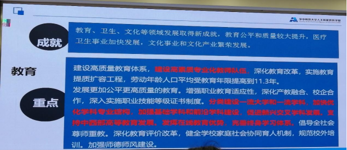 在政府工作报告学习这一板块,黄皓从政府去年工作回顾、“十四五”主要目标、今年主要目标和今年部分重点工作等方面展开,并介绍了教育方面的成就与重点、科技创新成就与重点及科研创新规划。