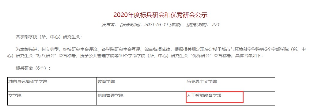 在人工智能教育学部成立的第一年,第一届人工智能教育学部研究生会在2020年度(2020-2021学年)基层学院研究生会考核评优工作中荣获 “标兵研会”荣誉称号。此次评选全校仅有6个学院获此殊荣。