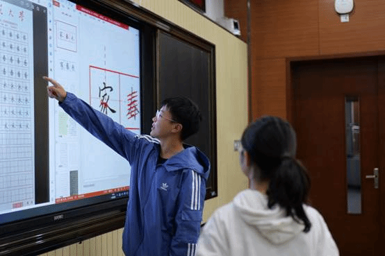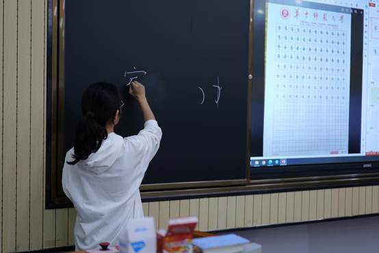 在介绍钢笔字的书写时,何舒凡指出部分笔画需要注意的重点书写方式,保证笔画的书写顺序、力道以及质感,以便学生在书写时能够理解深刻,得心应手。随后,何舒凡向学员们展示正确的书写笔画顺序以及力道控制等内容,并列举了几个错误的书写方法,让学员们通过在正误之间的对比,感悟钢笔字书写的要点。课上,何舒凡还邀请学员们上到讲台,让学员们近距离观察作业中书写的钢笔字,并请学员们发表自己的看法,让学员们主动思考与感受钢笔字的书写方式。在学员的实操过程中,何舒凡采取练习和纠错相结合的方式,走近学员,观察学员们的练习情况,针对不足及时给予意见,并以自己练习钢笔字的经验鼓励学员们努力练习。