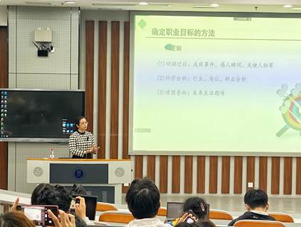吴雪以《筑梦青春志在四方,规划启航职引未来》为题,从“如何进行自我认知?”“如何分析职业环境?”“如何进行职业决策?”“如何进行计划与调整?”等方面进行了介绍。她建议学生利用心理测验或专家咨询客观测试等方式来进行自我认知评价,确定职业目标。并强调从工作性质、任务、内容,工作环境,工作要求等方面分析所选职业的素质要求,从而针对性地制定行动计划。吴雪认为实践尤为重要,她鼓励学生积极投身学生工作,社会实践,社团活动等提高自身综合素质。最后吴雪通过短视频激励大家,不要畏惧挑战,要突破自己,大胆追求热爱。