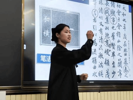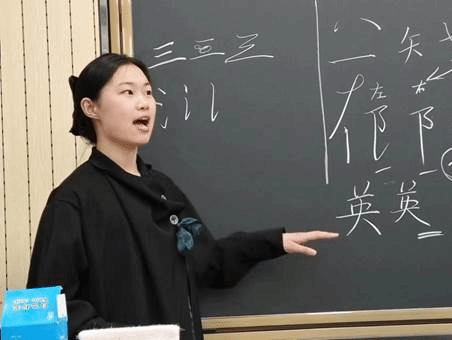 在介绍行楷书写时,石楠强调其书写特点:运笔稍快、牵丝引带、形态简化。随后,石楠向学员们展示了如何运用切笔、翻腕等技巧,掌握行楷的基本笔画。同时,她还结合具体的偏旁部首,引导学员们理解汉字结构,掌握正确的书写方法。在实操环节,学员们纷纷拿起粉笔,认真练习。石楠仔细观察每个人的练习情况,并针对存在的问题给予及时指导。这种互动式的教学方式不仅提高了课堂的趣味性,也让学员们更加深入地掌握了行楷书写的要领。