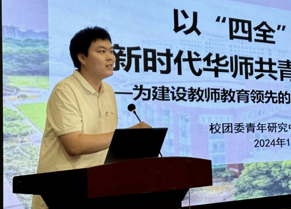 中场休息过后,校团委翁艾迪(学生)为学员们带来了课程——以“四全”理念推动新时代华师共青团高质量发展。他从自身成长经历出发,紧接着详细介绍了华师共青团的基本团情与团务工作。在授课过程中,翁艾迪强调了共青团的精神引领和价值导向,激励同学们为建设教师教育领先的世界一流大学贡献青春力量,做一名“有情怀、初心强,想干事、能奉献”的团学骨干。