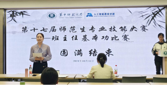 人工智能教育学部讯(记者李佳怡)为了促进师范生班主任技能培养意识和日常训练,提升师范生班主任基本技能水平,10月31日,人工智能教育学部在南湖综合楼7001教室成功举办了第十七届师范生技能大赛班主任基本功比赛学部初赛。本次比赛的选手是来自21级、22级和23级的本科生,莅临指导的评委有华中师范大学人工智能教育学部教育信息技术学院副教授、硕士生导师周平红,华中师范大学附属小学语文教师、班主任、备课组长蔡佳。