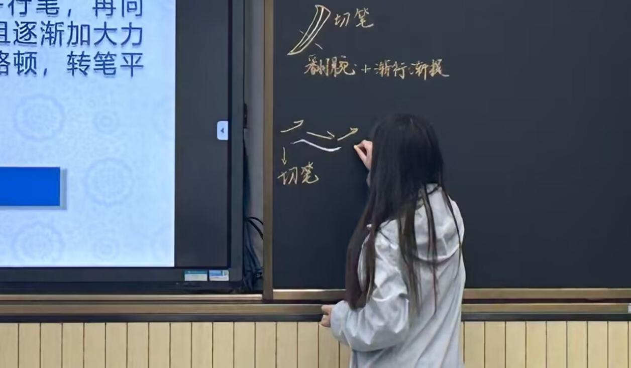 培训以“粉笔楷书技法·基本笔画”为重点,两位主讲人详细讲解了楷书的基本笔画,包括横、竖、撇、捺等,并结合实际书写示范,让各位学员更直观地理解笔画的运用和变化。此外,主讲人还带领学员们回顾了上节课所讲的转笔、翻腕、切笔三种技巧,将理论与实践相结合,使学员们能够更好地掌握粉笔字的书写技巧。