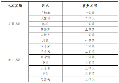 经选手展示、评审专家提问、评审专家打分等环节,共评出成长赛道一等奖1名,二等奖1名,三等奖3名。就业赛道一等奖1名,二等奖3名,三等奖4名。以下奖项获得者将具备推荐参加校赛复赛的资格。获奖名单具体如下: