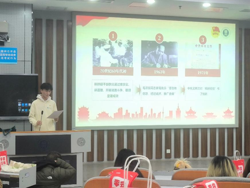 人工智能教育学部讯(通讯员:夏浩庭 高海丽)12月22日晚,“承‘枫桥经验’,创治理新篇”主题团课在南湖综合楼N111教室顺利举行,恽代英青年讲师团成员张逸洪针围绕“枫桥经验”进行理论宣讲。