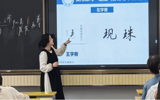 课程上半场以行楷书写技巧为核心内容。主讲人通过示范视频和现场板书,讲解了行楷的字形特点与部首演变规律。她以部首在字形中的位置作为分类,讲述了左字旁、右字旁、字头、字底的相关常见部首。在讲解中,主讲人还特别强调行楷三点水与两点水的写法区别。