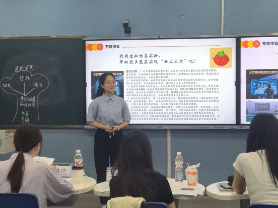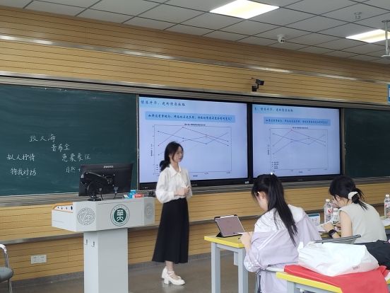 4月20日上午,决赛在八号楼举行。在主持人介绍完规则后,文科组与理科组双赛道竞技,选手们依次开始了限时10分钟的无生试讲。各科选手运用虚拟仿真实验、智能课件生成等数字化工具,设计创意课堂,文院选手《致大海》用折线图表示作者的情感变化,历院选手以“权力的游戏”带大家走进宋初中央集权加强的历程。授课完毕后,选手现场抽取演讲主题,围绕各学科热点话题,完成限时5分钟的即兴演讲。