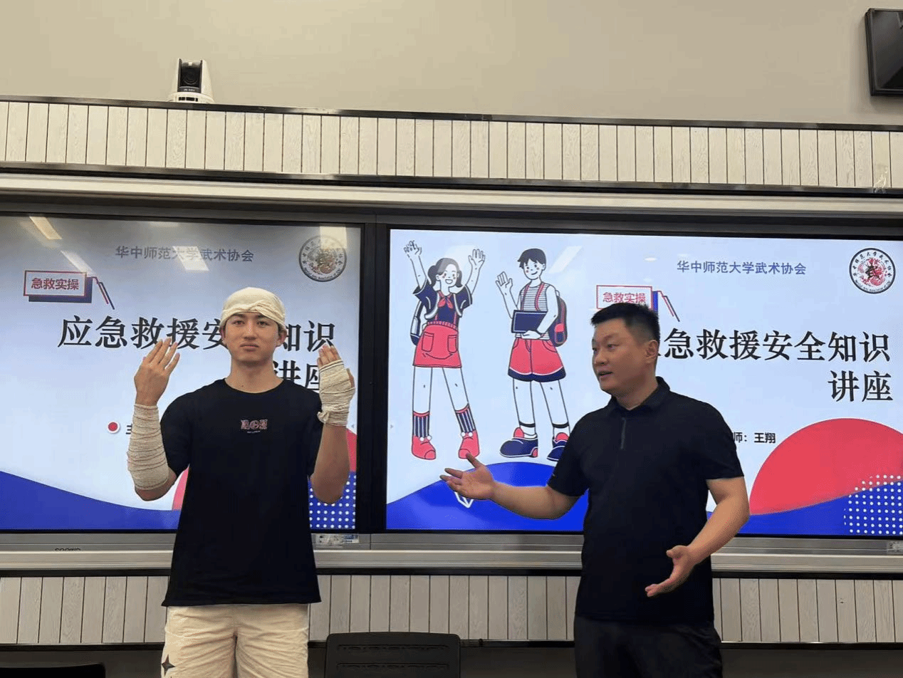 本次讲座活动邀请了武术协会指导老师王翔担任主讲人,主要讲解了几种急救包扎方法和注意事项,并详细阐述每种方法的适用场景与操作要点。