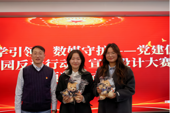 最后,支部举行了“科学引领,数媒守护——党建促进校园反诈行动”宣传设计大赛颁奖仪式。该比赛旨在通过创新设计形式传播反诈知识,增强校园师生的安全意识和法律意识,充分展现了党建工作与专业实践的深度融合,运用创意思维和设计语言来传递反诈知识,为校园安全护航。