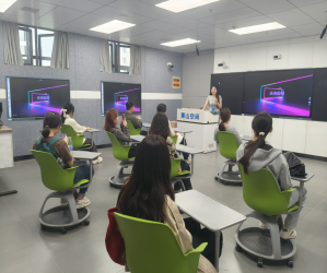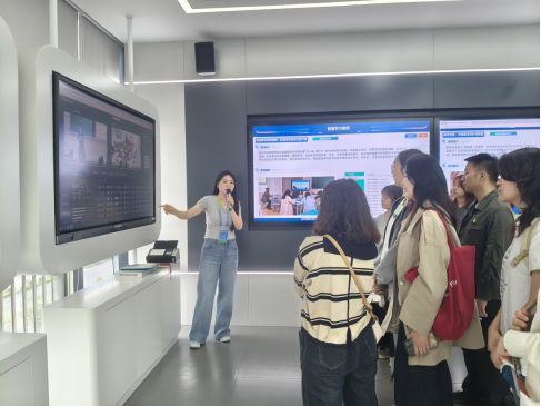 活动伊始,在研究院讲解员的带领下,师生们依次参观了智能教育装备展示区、智慧教室、智能教育生态展厅等专门展区。在智能教育装备展示区中,同学们亲身体验了科大讯飞智慧体育课堂、超星课外阅读机、华文众合书法课堂等AI教学实际应用场景,充分体会到数字教育的个性化和高效性。