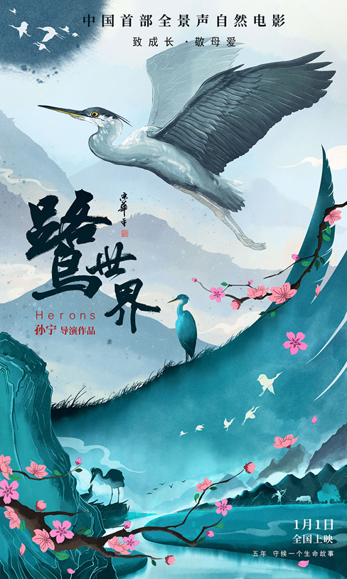 作为中国首部全景声自然电影,《鹭世界》近日发布国际版海报。海报以手绘形式展现了苍鹭展翅翱翔的状态,更有苍鹭哺育幼鸟的细节呈现。据悉,《鹭世界》讲述的是中国黄河中游湿地生态区一只苍鹭“泽一”的生存故事,将于2020年1月1日登陆全国院线。