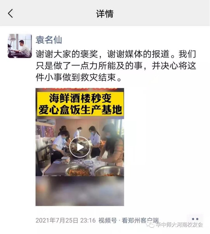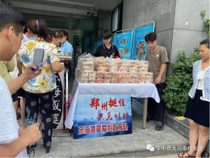 7月20日,河南全境遭遇特大暴雨,尤其省会郑州市更是遭遇了历史最强暴雨,市区出现严重内涝,城区大部分地区处于停水停电的状态,吃饭成为了大家最为迫切解决的问题。我校人工智能教育学部校友袁名仙(原信息技术系教育技术学专业2006届本科毕业生)在获悉上述情况后毅然作出决定,将其负责的东海盛筵海鲜酒楼迅速转变为爱心盒饭生产基地,将一份份热气腾腾的饭菜送到抢险一线和群众手中。